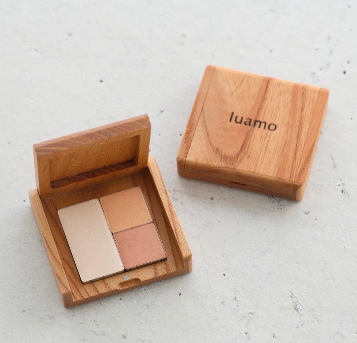 luamoのチーク、ハイライター、アイカラーの好きなカラーを選んで、木製のパレットにセット。